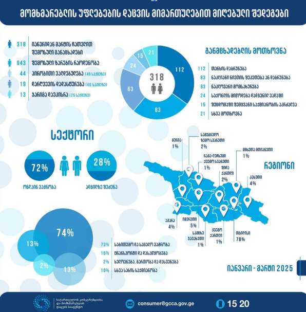 – აღნიშნული ინფორმაცია საჯაროა და გამოქვეყნებულია სააგენტოს ვებ გვერდზე. მაგალითად 2025 წლის დასაწყისში ( პირველ 3 თვეში)მომხმარებლის უფლებების დაცვის მიმართულებით 318 განაცხადი დაფიქსირდა. შემოსული განცხადებების რაოდენობა 40%-ით აღემატება წინა წლის დასაწყისში შემოსულითა რიცხვს. განცხადებებიდან 72% ონლაინ ვაჭრობის ფაქტს ეხებოდა, 13 მოვაჭრეს კი 25 საქმეზე დაეკისრა ჯარიმა, ჯამში 13 573 ლარის ოდენობით.