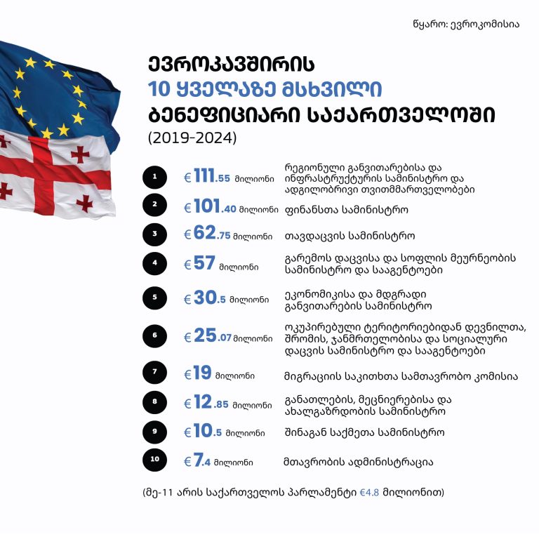 ევროკომისიის მონაცემების ბოლო ანალიზის საფუძველზე, 2019-2024 წლებში საქართველოს სამინისტროებისა და სხვა სახელმწიფო ინსტიტუტების მიერ მიღებული ევროკავშირის დაფინანსება 517 მილიონ ევროს შეადგენდა.