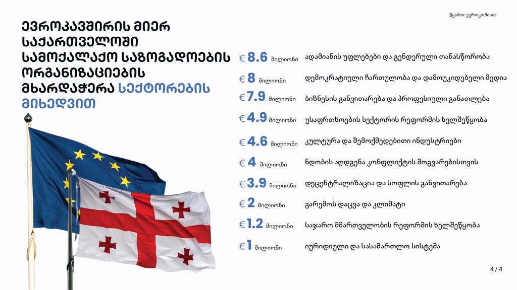 ამასთან, 2019-2024 წლებში ევროკავშირისგან მიღებული 46.1 მილიონი ევროს ორ მესამედზე მეტი განკუთვნილი იყო სამოქალაქო საზოგადოების ორგანიზაციებითვის საქართველოს მოსახლეობის დასახმარებლად და სერვისების ხელმისაწვდომობის უზრუნველსაყოფად ისეთ სფეროებში, როგორიცაა: მოწყვლადი ჯგუფების მხარდაჭერა, პროფესიული განათლება, მეწარმეობა, სოციალური სერვისები, ახალგაზრდების ჩართულობა და თემის განვითარება, კულტურის სფერო, გარემოს დაცვის ღონისძიებების გატარება.