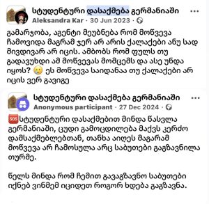 “სტუდენტური დასაქმება გერმანიაში” არის Facebook ჯგუფი, სადაც ახალგაზრდები ცდილობენ მათთვის საჭირო ინფორმაციის მოძიებას. აქ შეხვდებით სტუდენტებსაც, რომლებიც მსგავსი თაღლითური სქემის მსხვერპლნი გახდნენ.